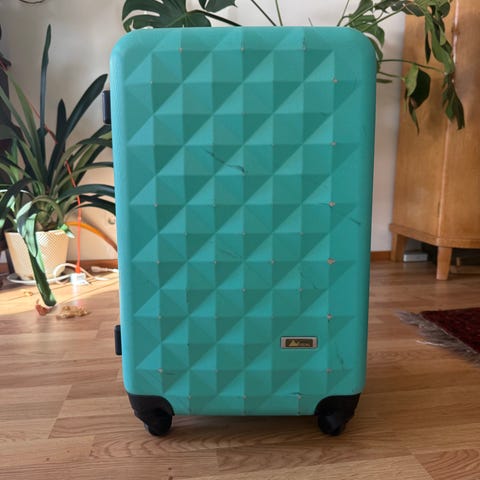 Myydään hyvässä kunnossa FERU Iso matkalaukku. Mitat 73x46x25cm. Mitkalaukku on 4 pöyrää ja kevyt.