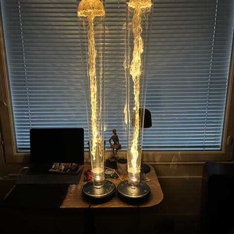 Meduusalamppu, säädettävät ledit, lasikupu. Uusi. Sisältää myös muuntajan ja kaukosäätimen . Nouto tai toimitus lähialueelle.