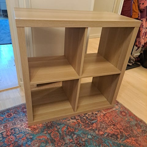 Kuvien mukainen Ikean 2 x 2 lokerikko. Lokerikossa on käytön jälkiä. Väri tumman ruskea.