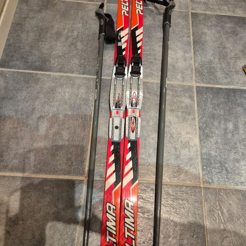 Peltonen Ultima 160 sukset ja Excel 105 cm sauvat. Rottefella NNN siteet.
