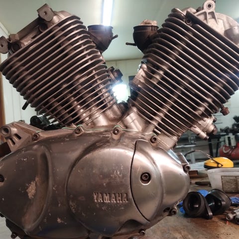 Yamaha R1 moottori osina ja runko mistä perä leikattu irti ja tankki, s3kä sähköt ja mittaristo..