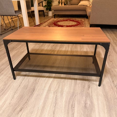 Musta, lack-pöytä lasikannella. Lasi ehjä, pöydässä pientä kulumaa.