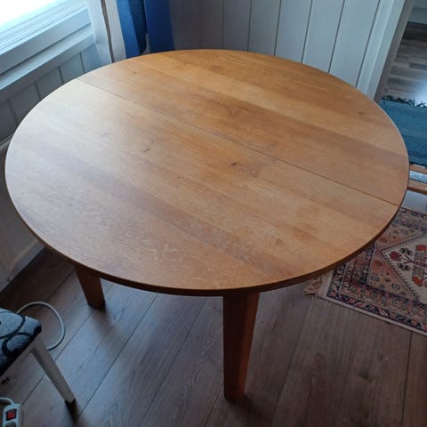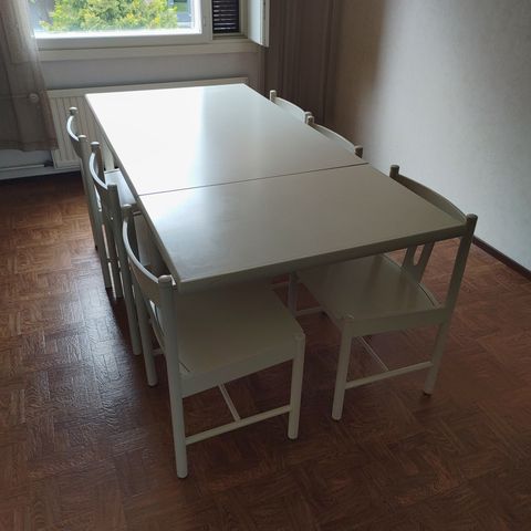 Entisöity pöytäryhmä 40-luvulta, pöydässä 3 jatkolevyä, leveys 24,5cm kpl. Tuolit loimukoivua uudelleen verhoiltuna.