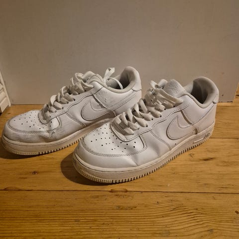 Käytetyt nike air force 1. Pohja on kulunut, mutta ei ole mitään reikiä. Kuluman jälkiä muuallakin.
