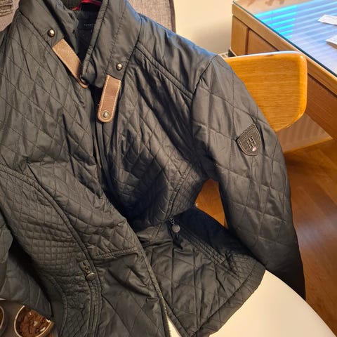 Hyväkuntoinen tummansininen tikkitakki, useampi tasku ja vetoketjulla piiloon laitettava ohut huppu.