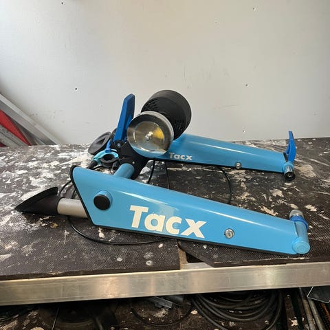 Tacx Flow Smart harjoitusvastus. Mukana harjoitusvastus, koroke eturenkaan alle, harjoitusrengas ja virtajohto. Täysin toimiva.