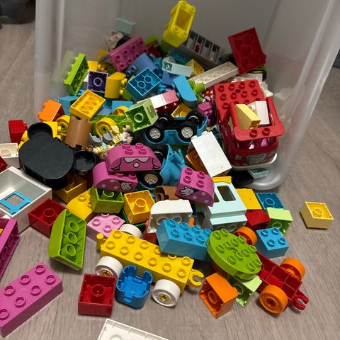 LEGO DUPLO rakennuspalikat sisältäen erilaisia palikoita ja osia. Mukana säilytyskassi, joka helpottaa palikoiden säilytystä ja kuljetusta. Sopii lapsille leikki- ja oppimiskäyttöön. Iso kasa.