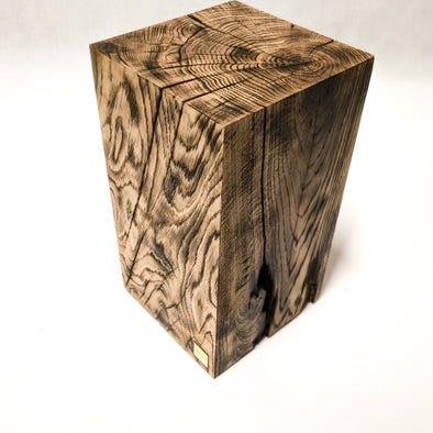 Veistoksellinen kierrätyspuusta valmistettu kiinteä tammi-monoliitti, jonka pinta on osittain syvän mustaksi poltettu Shou Sugi Ban -menetelmällä ja osittain luonnollisena raakana tammipuuna, korostaen syitä ja halkeamia. Se on 35 cm korkea ja sen pinta-ala on 19 cm kertaa 19 cm. Tämä pöytä on valmistettu vanhasta kierrätyspuusta, mikä antaa sille uuden elämän.