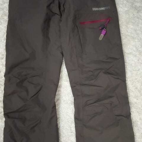 Myydään naisten Didriksons ulkoiluhousut koossa 40. Sopivat monenlaiseen ulkoiluun ja urheiluun. Lahkeiden pitkät vetoketjut helpottavat esim. laskettelumonojen kanssa pukemista. Kunnossa ei moitteita.