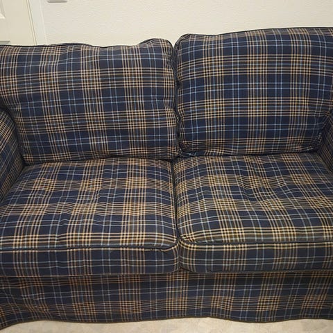 Paljon käytetty mutta toimiva vuodesohva. Valkoisessa päällisessä muutamia tahroja.