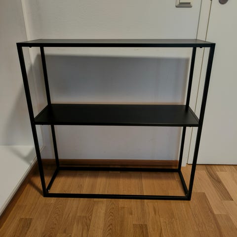 Metallirunkoinen hyllykkö, hyllylevyt laminaattia. Jyskistä ostettu uutena noin vuosi sitten. Siisti ja hyväkuntoinen. Jaloissa ruuvit joista mahdollisuus säätää korkeutta, käy siis hyvin esim. kylpyhuoneen kaltevalle lattialle.
