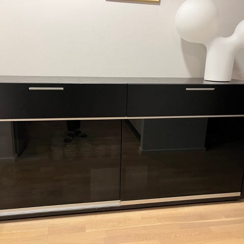 lipasto / senkki) muuton vuoksi Syvyys 42 cm, tason korkeus 87 cm, vitriinin kanssa 202 cm, leveys 3m, vitriinin leveys 160 cm. 4 vetolaatikkoa, tummennettujen lasiliukuovien takaa löytyy