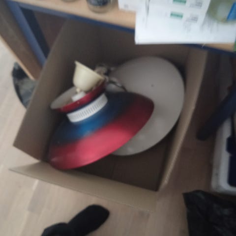 Myydään 2kpl valaisimia. Pöytälampun korkeus 47cm, kattolampun halkaisija 32cm. Kattolampun sisäpuoli valkoinen. Kuvussa (jolla kasataan ylimääräiset johdot) oleva muovinen "kiristysruuvi" hieman kärsinyt.