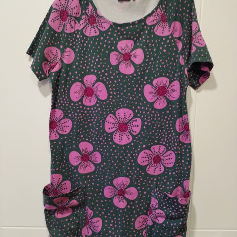 Marimekko tunika-mekko, koko S. Kainaloissa hieman tummuutta. Kai-kai 44 cm, olka-helma 84 cm. Savuton koti.