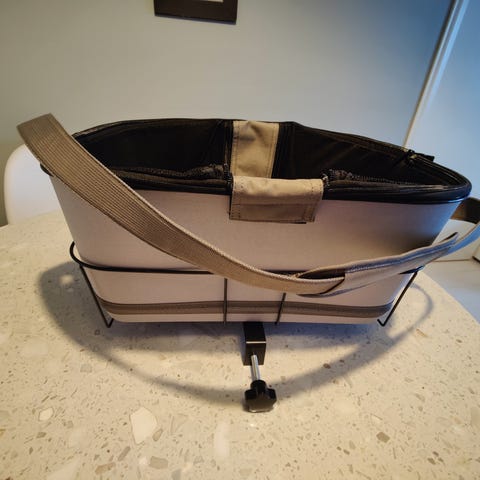 Lemmikin vaalea/musta kantokoppa. Noin vuoden ajan muutaman kerran käytetty autossa. Yläosan yksi putki rikki, joten ei täysin ehjä ole mutta kangas ja vetoketjut ehjät. Kopan saa siis muuten kiinni ja pystyy nostamaan mutta yksi yläosan reuna ei ole putkella tuettu. Tukeva koppa muuten mutta sattui vahingossa olemaan kerran tiellä, kun ihminen kompastui ja kaatui painollaan putken päälle. Ei ollut eläintä silloin kopassa.