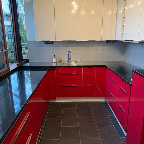 Keittiökalusteet, joissa on amaranth ja vaalean harmaa oviväri. Sisältää työtason, kaapit, integroidun uunin ja induktiolieden. Altaan ja hanan, valaistuksen. Saksalainen laadukas consept130 / Häcker keittiökalusteryhmä. Laatikostoissa ja kaapeissa on korkealaatuiset mekanismit ja monipuolisilla toiminnoilla olevat kodinkoneet .