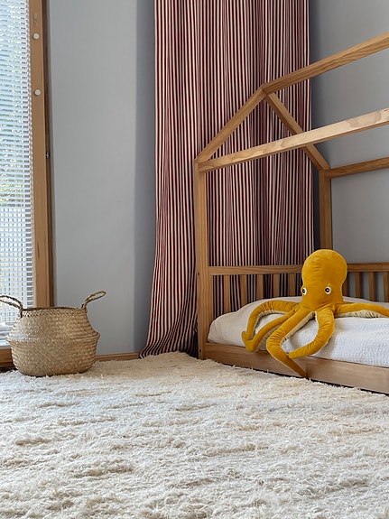 Marokkolaista estetiikkaa mukaileva valkoinen raidallinen berberimatto, jossa yhdistyvät pehmeys, selkeä kuvio ja ajaton rauhallisuus. Mustat raidat tuovat pintaan juuri sopivasti rytmiä ja elävyyttä, mutta kokonaisuus pysyy kevyenä ja helposti sisustukseen solahtavana.
