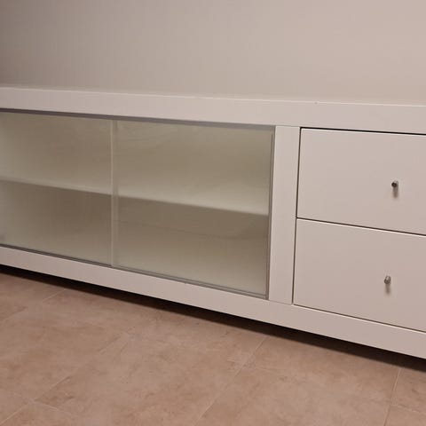 Keskellä liikuteltava lasiovi, keskellä olevat irroitettavat tasot, sekä tv tason takaseinään pari porattua pyöreää isoa reikää piuhoja varten.