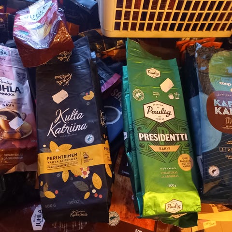 Kuvassa olevat kahvipussit 152kpl tarjouksen perusteella. juhlamokka, tumma kultakatriina, kultaiset isot laitoskahvipussit joita eniten. postitus 10€