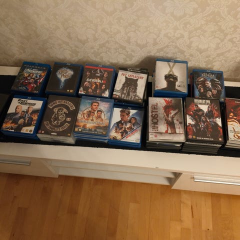 Blu-ray elokuvia 59 kpl, joista 4 vielä muoveissa. Dvdeitä on 10 kpl. Koko paketissa siis 69 kpl.