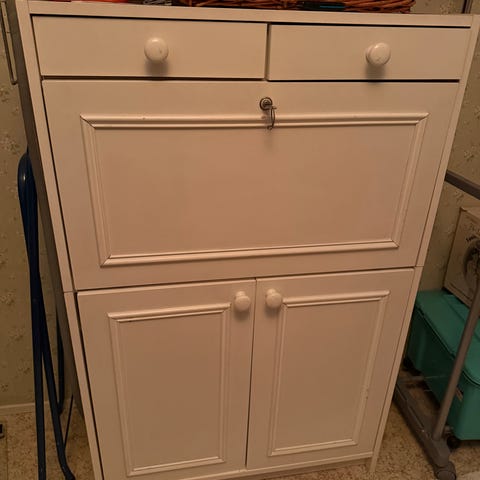 Kaappi vaatii pinnasta huoltoa, pinra on naarmuinen. Avain lukkoon hukassa.