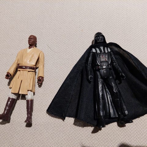 Hahmot ovat Darth Vader, Boba Fett (siltä tuo naru osa vähän rikki) sekä Yoda (sen valomiekka ei ole alkuperäinen. Ovat vähän isompi kokoisia kuin hahmot joita kerään, joten nämä myyntiin!