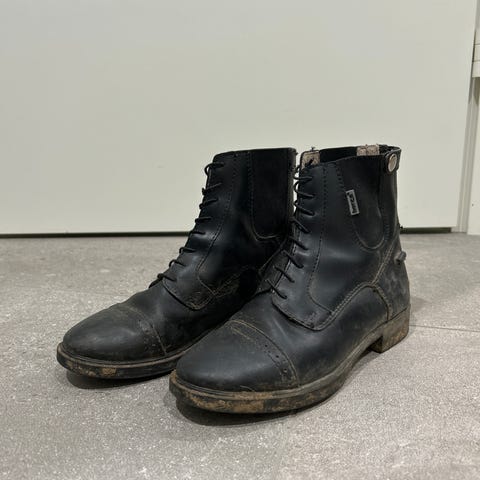 Horze ratsastuskengät, koko 35. Kengät ovat nilkkapituiset ja niissä on joustava kuminauha sivuilla ja vetoketju takana.