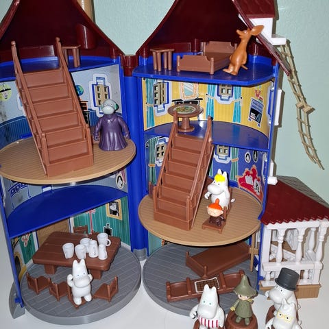 Myydään muumitalo + tavaroita. Muumitalo on siistissä käytetyssä kunnossa, muutama ikkuna puuttuu.