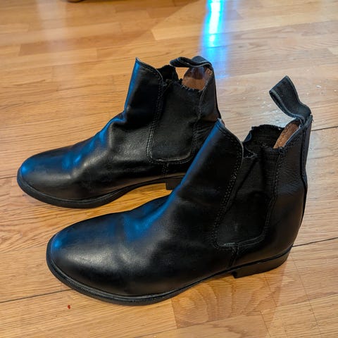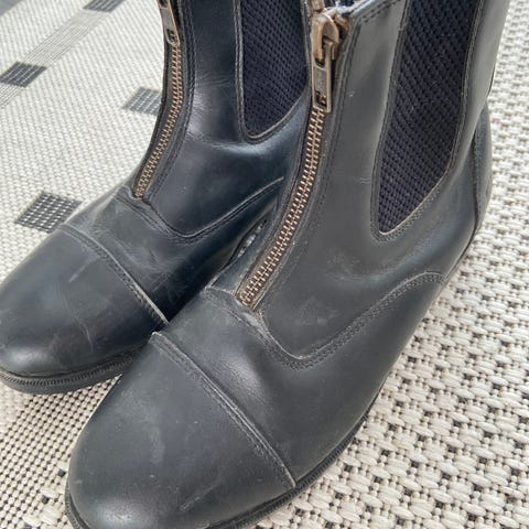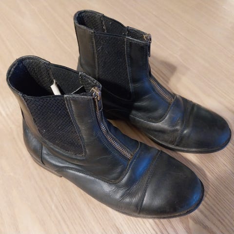Ratsastuskengät, koko 38. Kengät ovat nilkkapituiset ja niissä on joustava kuminauha sivuilla ja teräsvahvike kärjessä.