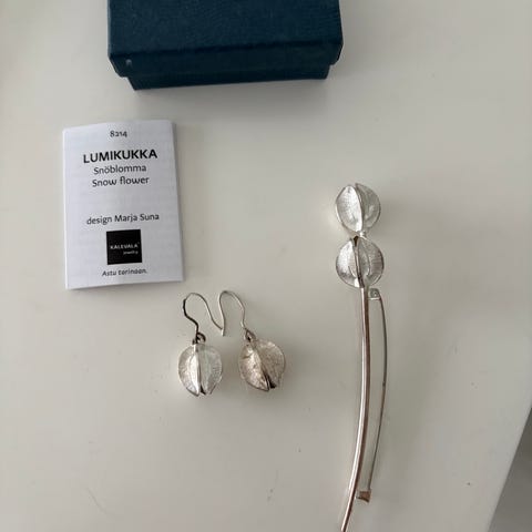 KALEVALA, LUMIKUKKA, kullanhohtoinen pronssiriipus ja korvakorut settinä 74 e + 5.90 e seurannalla kotiin ja rasia ja LUMIKUKKA-tarinalappu mukaan
