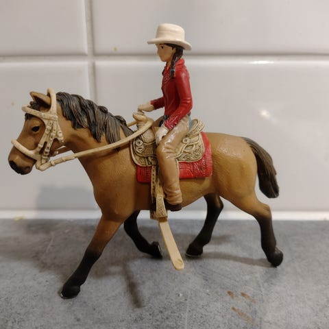 Lännenratsastaja Roni ja vanha pinto-ori. Suitsien leukahihna katki, muuten kaikki ehjiä ja hyväkuntoisia. Nouto Ritaharjusta tai postitus toridiilillä