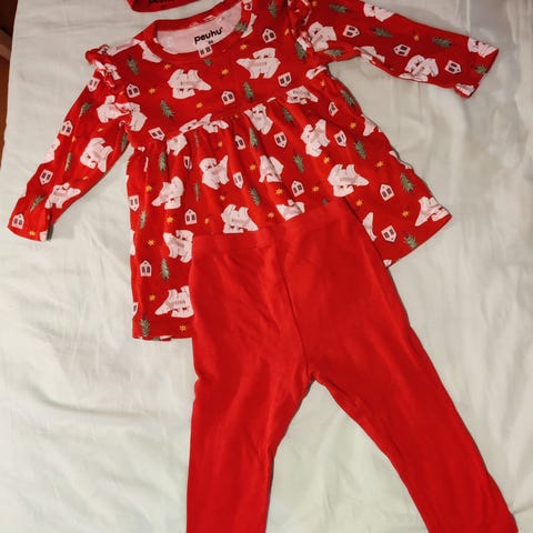 Punaiset housut ja kaksi joulukuvioista bodya, koko 80 cm.