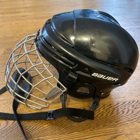 Hyvässä kunnossa oleva Bauer häkillinen lasten jääkiekkokypärä. Luulisin että on S-koko. Ollut 7-9 vuotiaan käytössä