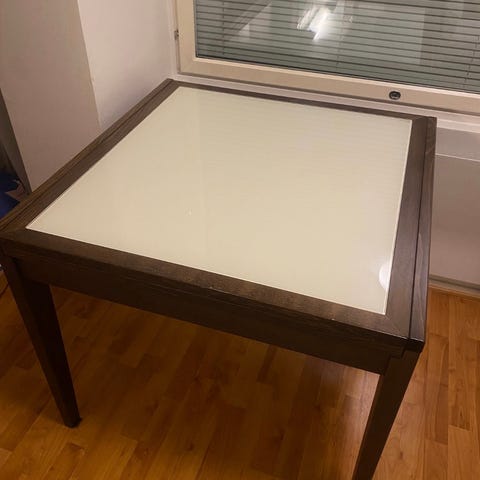 Kaunis Vintage ruokapöytä lasikannella. Yhdessä kulmassa pieni särö