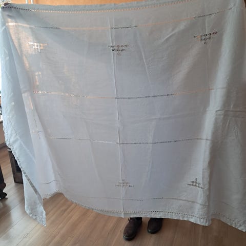Kaunista käsityötä oleva kirjailtu pöytäliina. Siisti ja ikäisekseen hyvässä kunnossa. Yhdessä kohdassa huomaamaton kuluma. (Kuva) Koko 85 cm x 90 cm