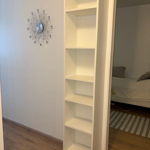 Valkoinen kirjahylly, 5 hyllylevyä jota voi siirtää sopivalle kohdalle.