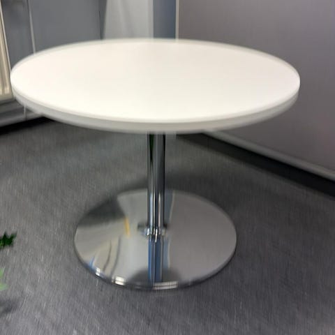 Siisti ja tukeva pyöreä pöytä metallijalalla sekä kaksi punaista tuolia. Sopii hyvin keittiöön, taukotilaan, toimistoon tai liiketilaan.