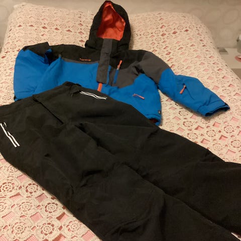 Miesten Surface-merkkinen lasketteluasu. Koko 50. Takki ja housut. Takinkaulus kulunut ja oikeanpuoleisen taskun vetoketju rikki.