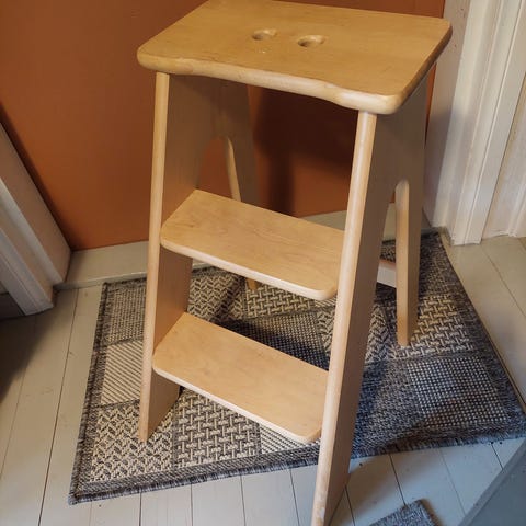 Valkoiseksi maalattu puinen Jaakko porrasjakkara.