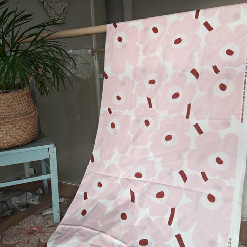 Ompelematon ja käyttämätön pala Marimekon puuvilla satiinikangasta, jossa kultaiset yksityiskohdat. Pituus 1.95m ja leveys 1,45m. Jäänyt käyttämättä, kaunis kangas.
