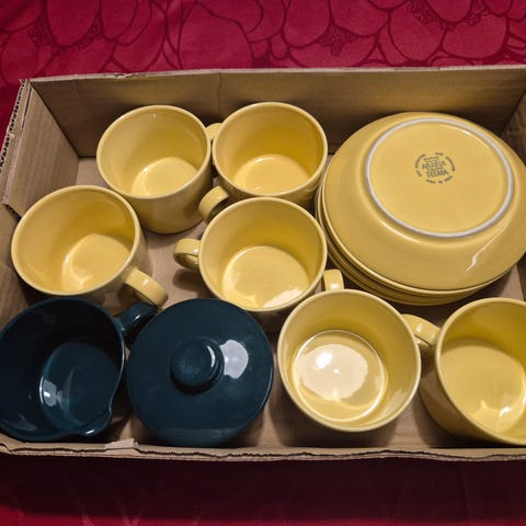 Isompia lautasia yksi puuttuu mennyt rikki ja yhdessä pieni kolhu joka näkyy kuvassa. 6kpl kahvikuppeja, 6 pientä lautasta ja 5 isompaa.