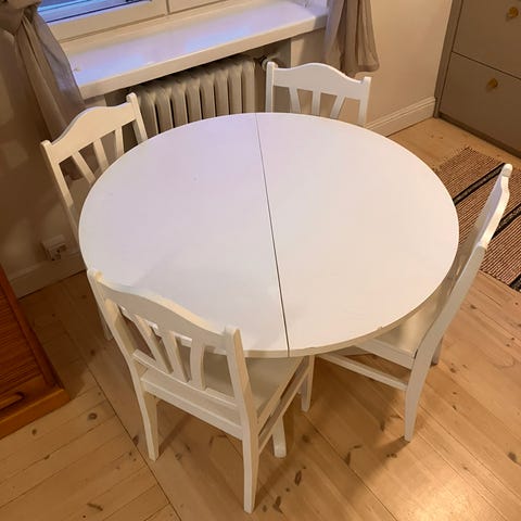 Ruokailuryhmä, 4 kpl tuoleja, vanerinen pyöreä pöytä
