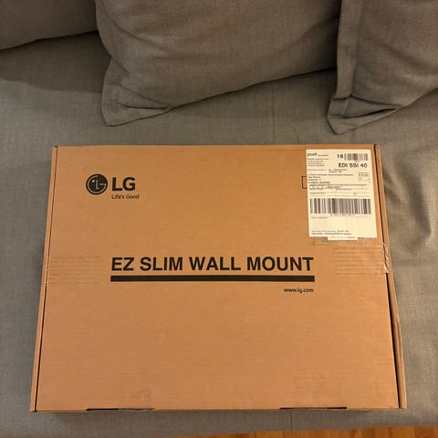 Pelkkä teline, ei mukaan ruuveja tai ohjeita. Hyvät ohjeet löytyy LGn nettisivuilta.