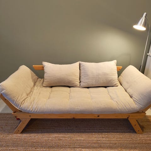 Karup Designin japanilaishenkinen, minimalistinen daybed, valmistettu vaaleasta puusta. Mukana on vaalea patja (väri: Naturel), jossa on irroitettava kangaspäällyste ja napitettu pinta. Soveltuu päiväunille, sohvaksi, ja vierasvuoteeksi. Kevyt, 29 kg. Toiminut vuoden verran vierassohvana. Eläintalous: patja on käytössä suojattu toisella pestävällä pehmusteella.