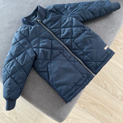 Kaksi taskua, hyvin toimiva vetoketju. Toinen lenksu rikki, vaatii uuden napin. Hihansuissa pientä kulumaa.