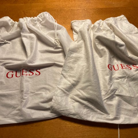 Valkoinen dustbag mustalla DKNY -tekstillä. Flanellin kaltainen kangas.