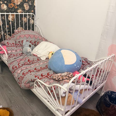 IKEA Juniorisänky lastenhuoneeseen. Sopii juniorikäyttöön, neutraali väri ja kestävä materiaali.