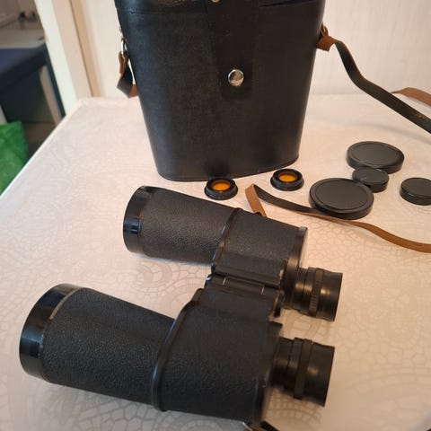 Laadukkaat Zuihon kiikarit nahkakotelossa. Kiikarien suurennus 7x, objektiivin halkaisija 50mm. Ehjät, toimivat ja siistit.
