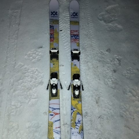 Völkl Gotama Twintip / Temppusukset Markerin siteillä. Suksissa näkyy normaalia käytön jälkiä ja on ihan ok. Suksien pituus 128 cm.
