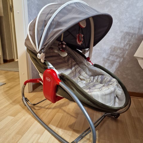 Tiny Love kehto / sitteri. Saa kolmeen eri asentoon (makaava, koho, puoli-istuva. Jalkoja säätämällä saa pysymään paikallaan tai keinumaan. Värinätoiminto. Irrotettava mobile, jossa valoja ja musiikkia. Irrotettava patja.
